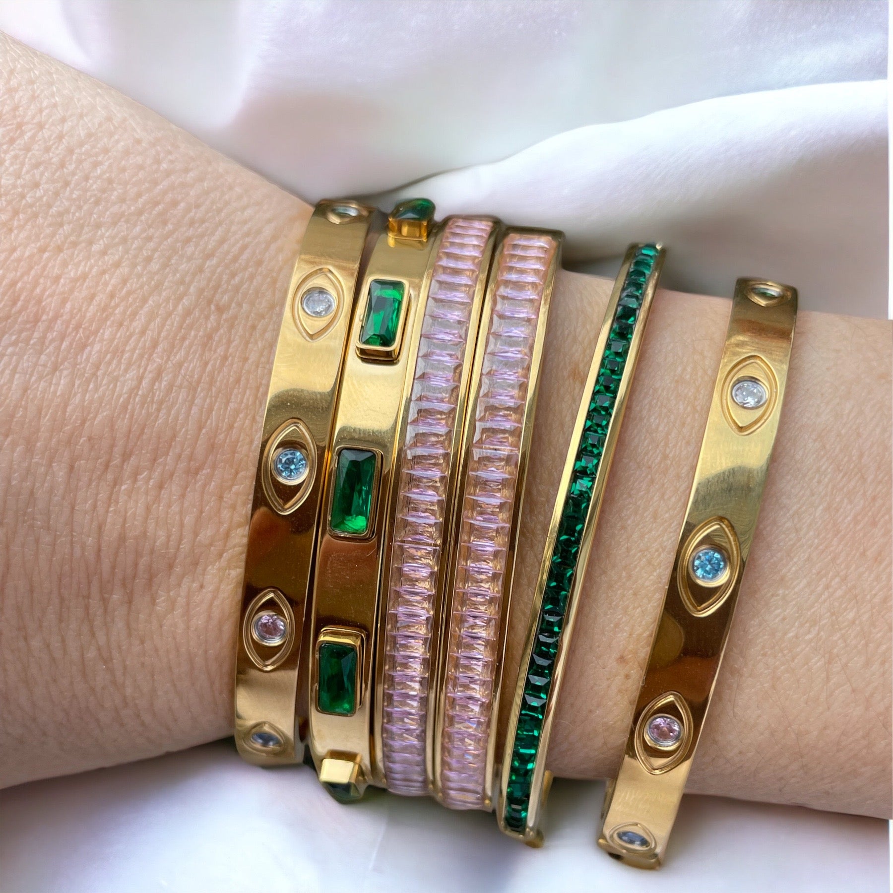 18 karat gold dipped stainless steel bangle with snap closure and Pink clear stones Expertly crafted with 18 karat gold dipping, this bangle is made of durable stainless steel and features a secure snap closure adorned with beautiful Pink clear stones. This means you'll have a long-lasting and elegant accessory that's perfect for any outfit or occasion. Plus, the added sparkle from the Pink clear stones will make you stand out in the best way possible.