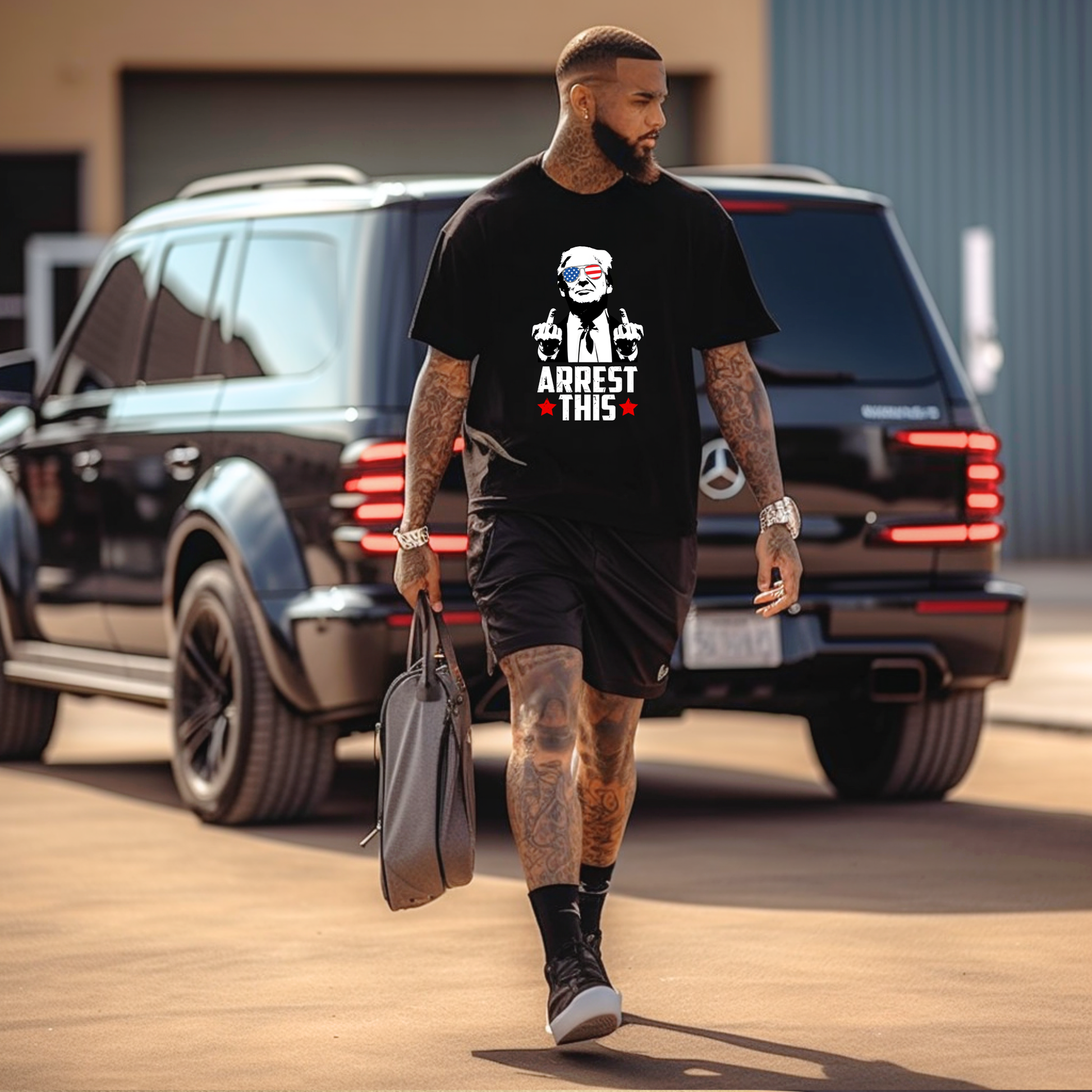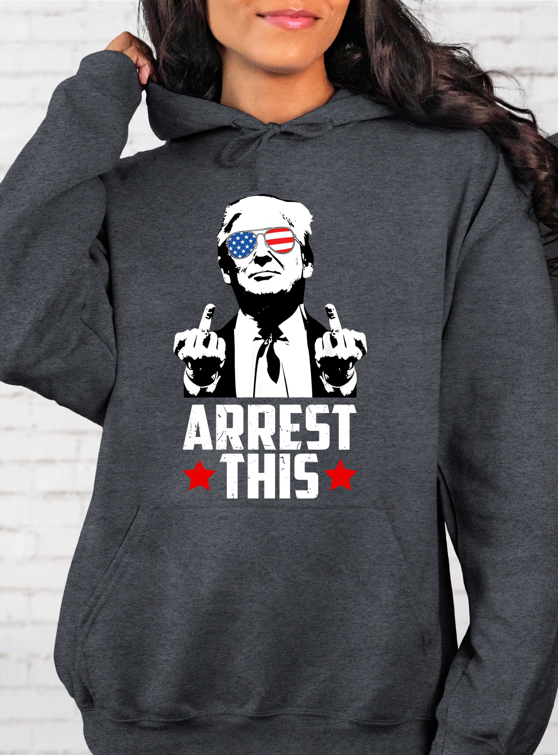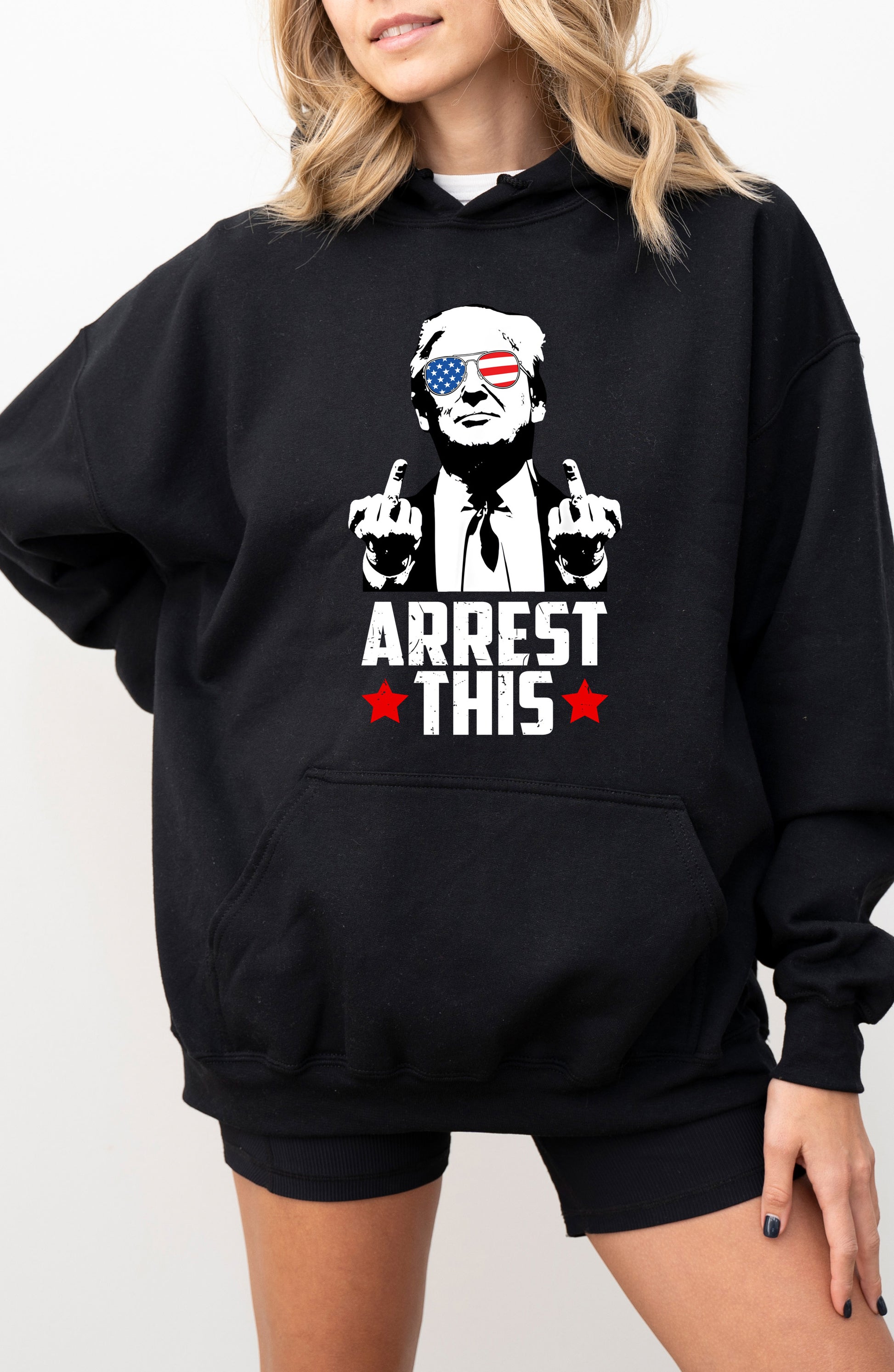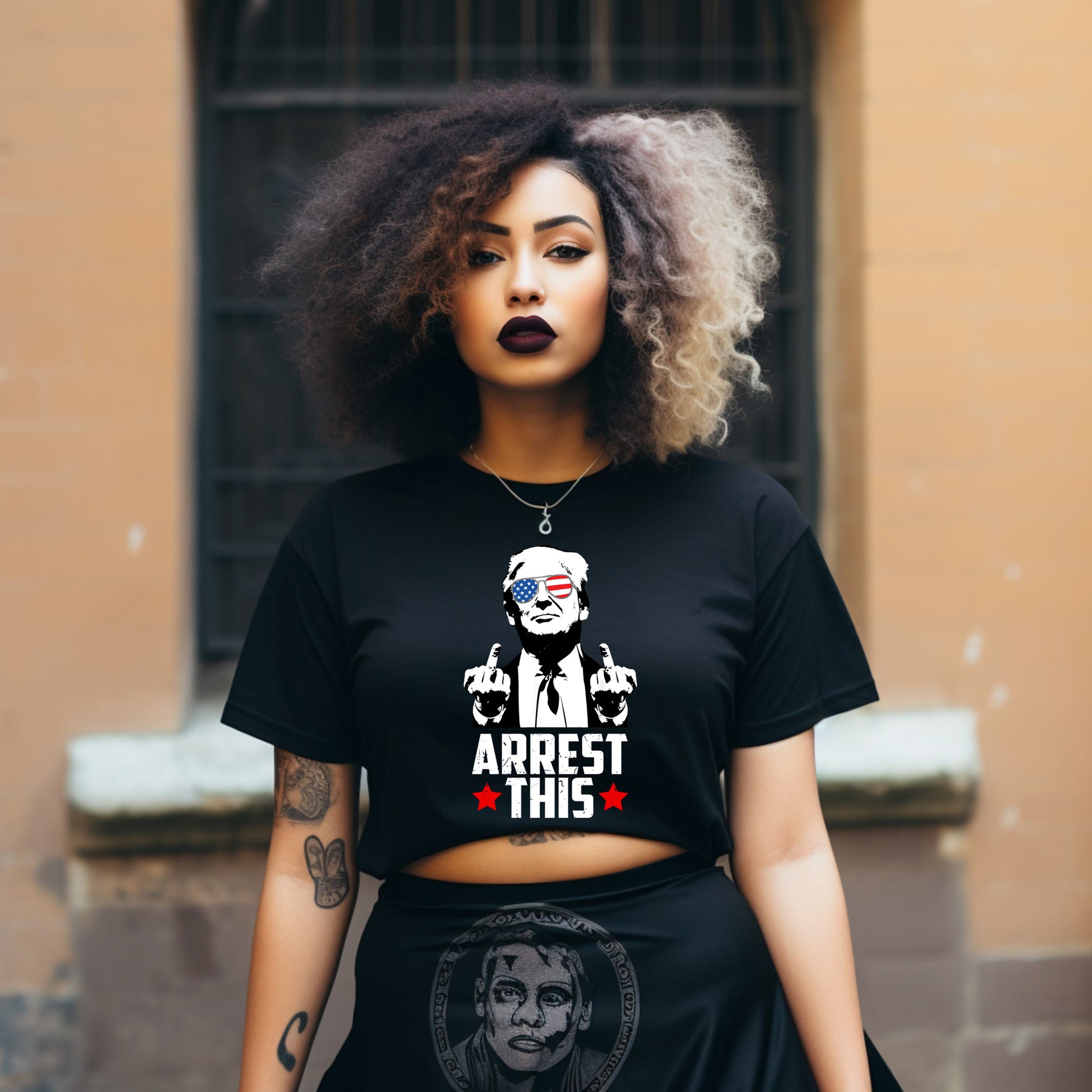 Get ready to show off your rebellious side with the TRUMP Arrest This Shirt. This playful shirt features a bold middle finger graphic and a powerful message. Perfect for making a statement and standing up against the status quo. (Middle finger pun intended.)